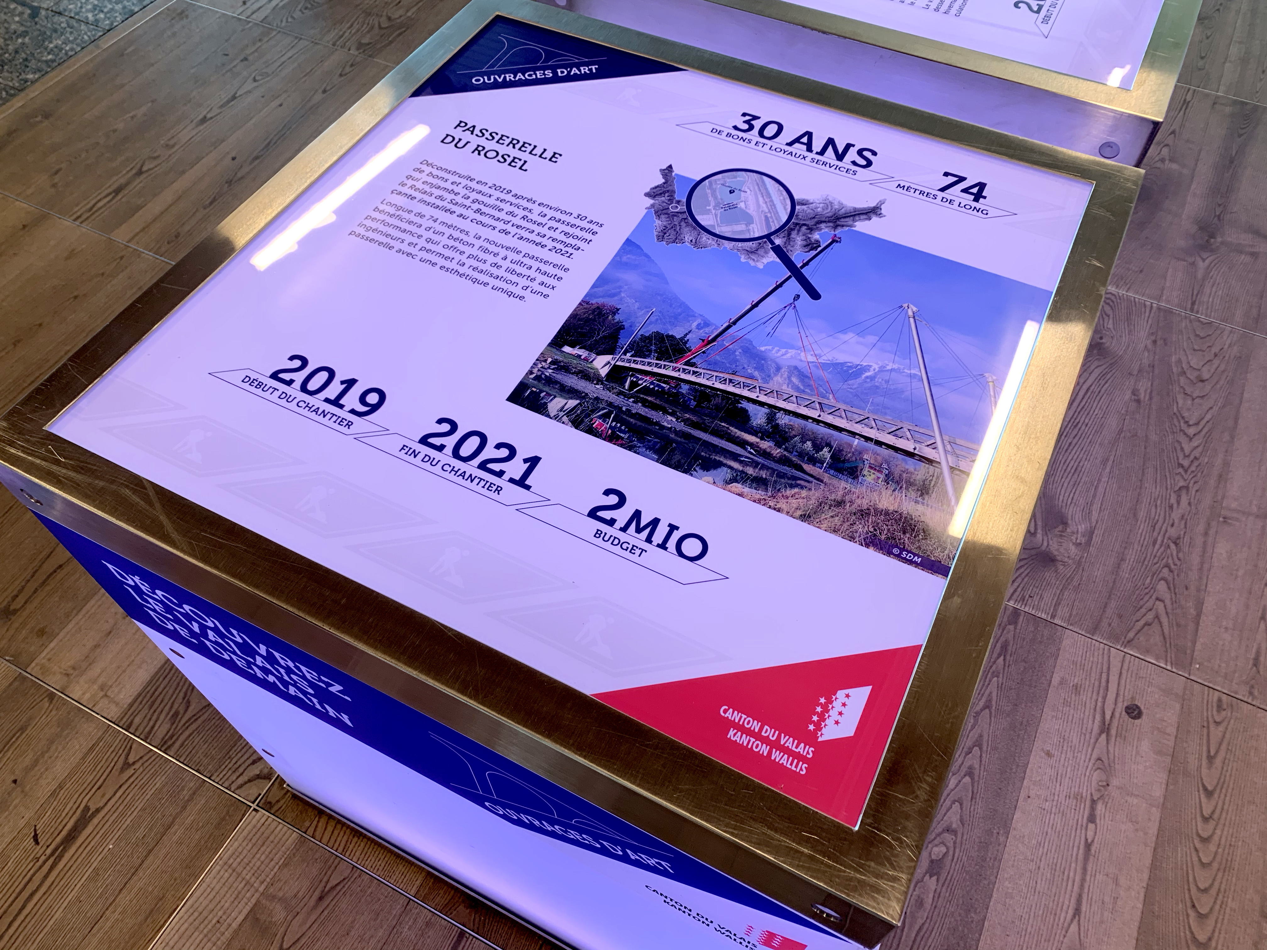 L’exposition « Le Valais de Demain » a été réalisée dans le cadre de l'installation de la nouvelle passerelle du Rosel en collaboration avec le Service de la Mobilité de l’État du Valais. En plus de présenter les particularités de la nouvelle passerelle du Rosel, elle présentait également d’autres importants projets d’urbanisation valaisan comme le tunnel des pyramides d’Euseigne ou encore le réaménagement du village de Vionnaz.
