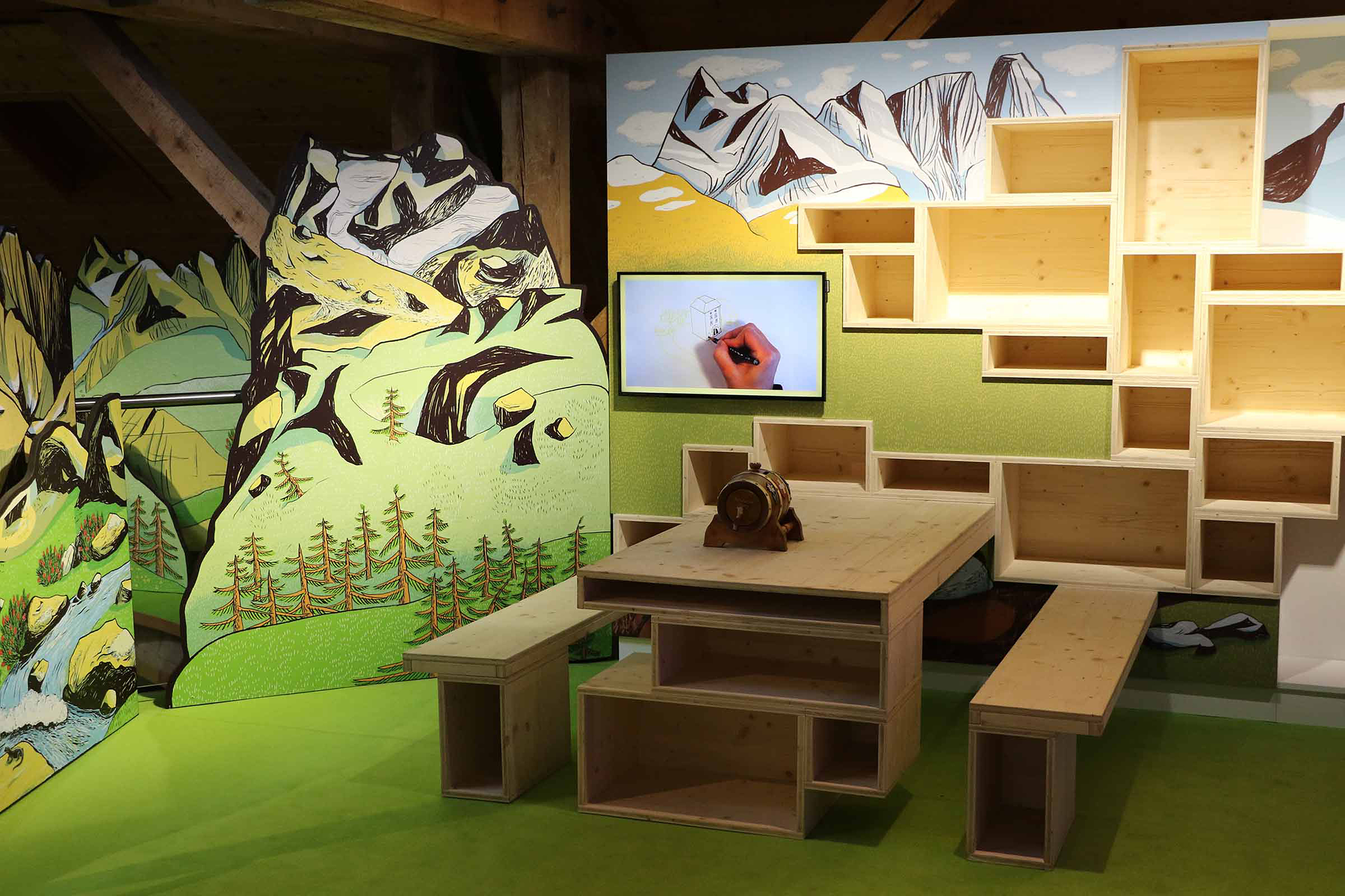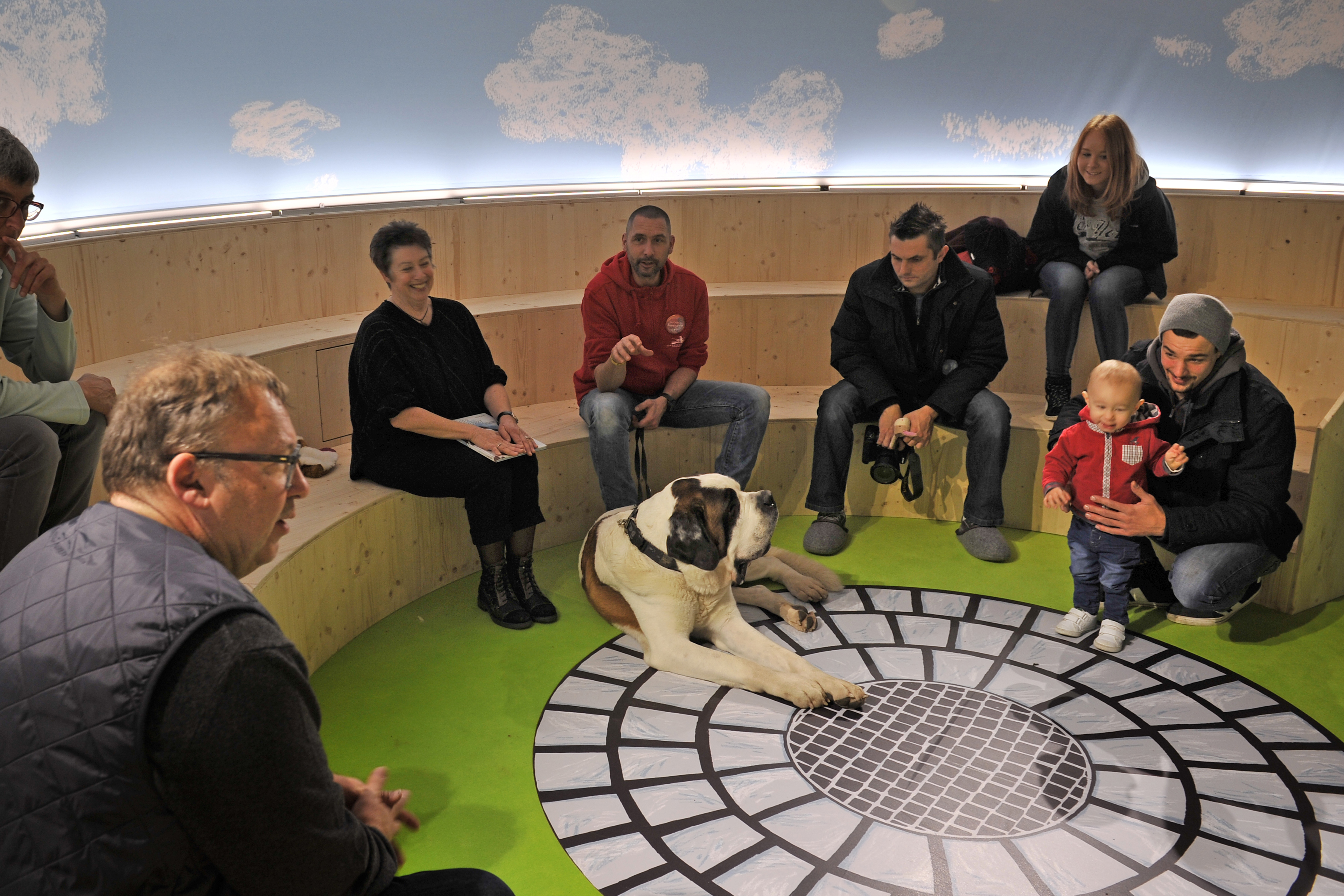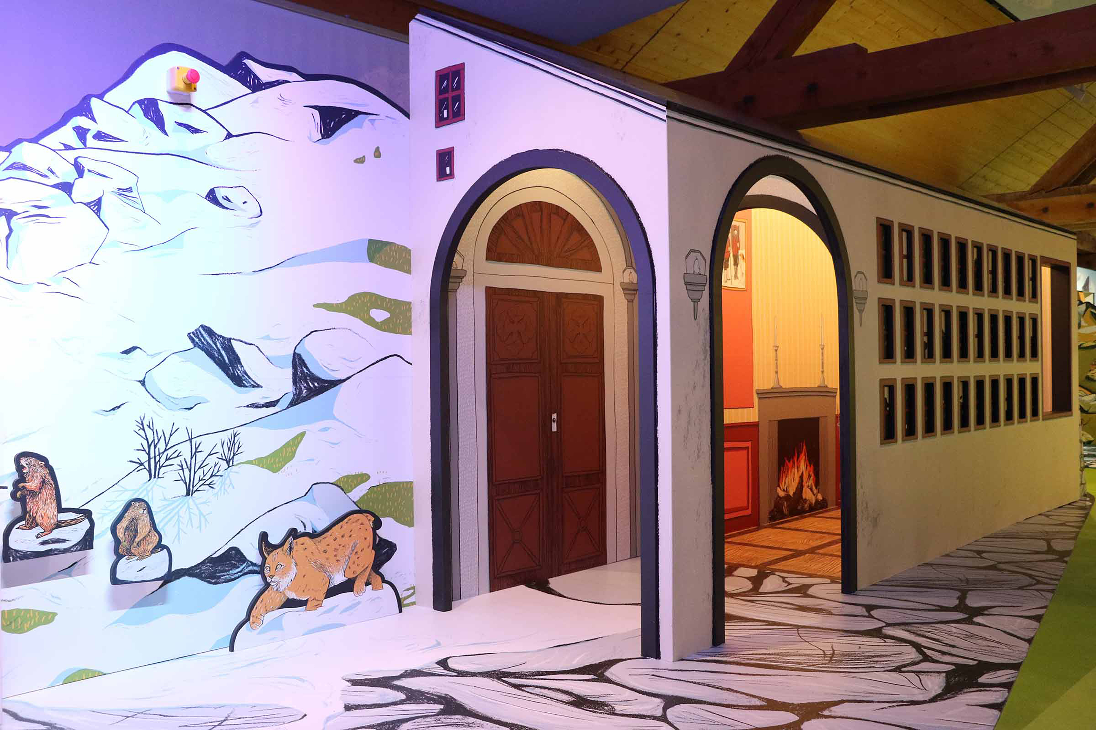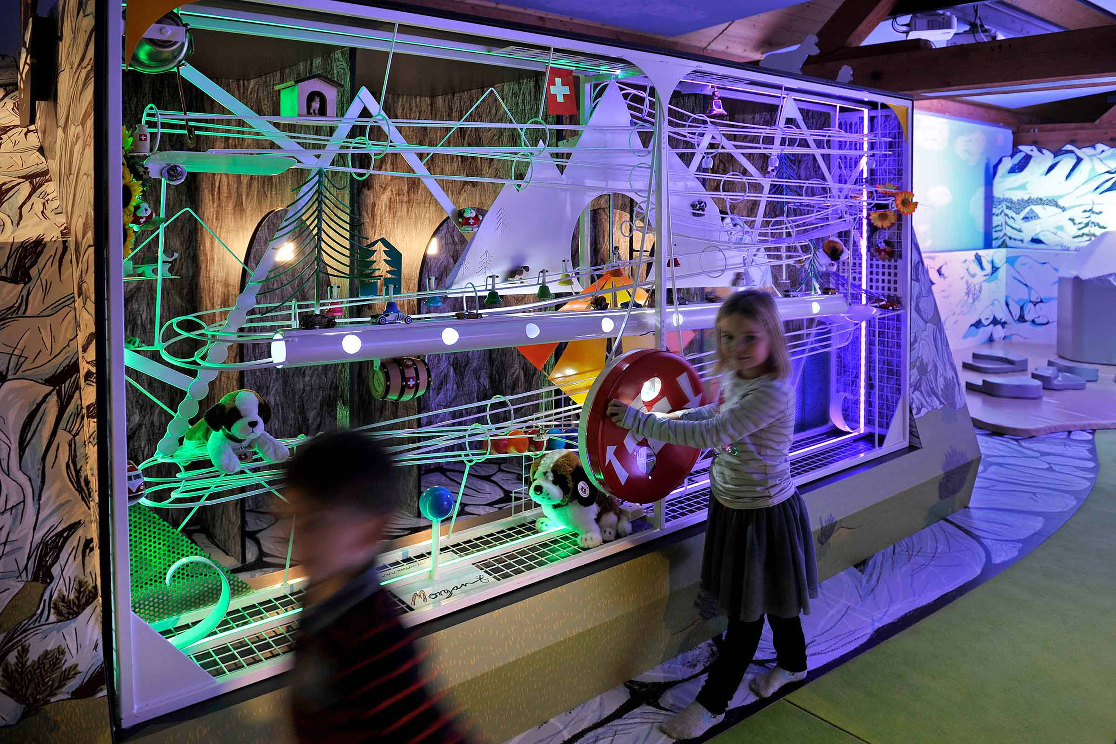 Dans un décor alpin, les enfants peuvent évoluer librement en découvrant l’histoire de l’hospice du Grand Saint-Bernard et ses célèbres chiens. Sculpture cinétique, show interactif, présentations de chiens vivants… L’espace se veut modulaire et flexible, pour une expérience toujours différente et ludique.