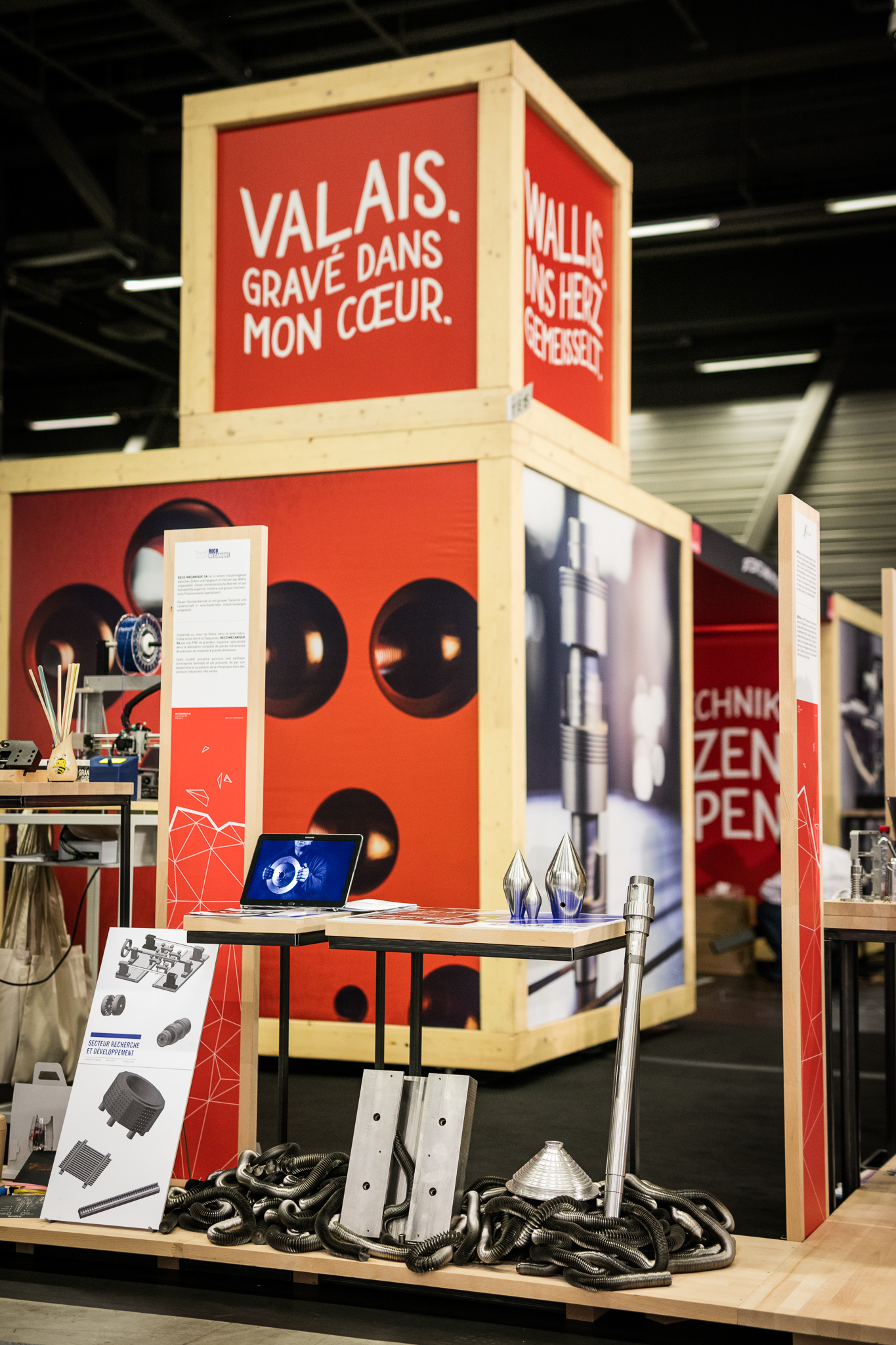 Conception et réalisation d’un stand promotionnel pour Valais Wallis Promotion à l’occasion du Salon SwissTech, à Bâle.