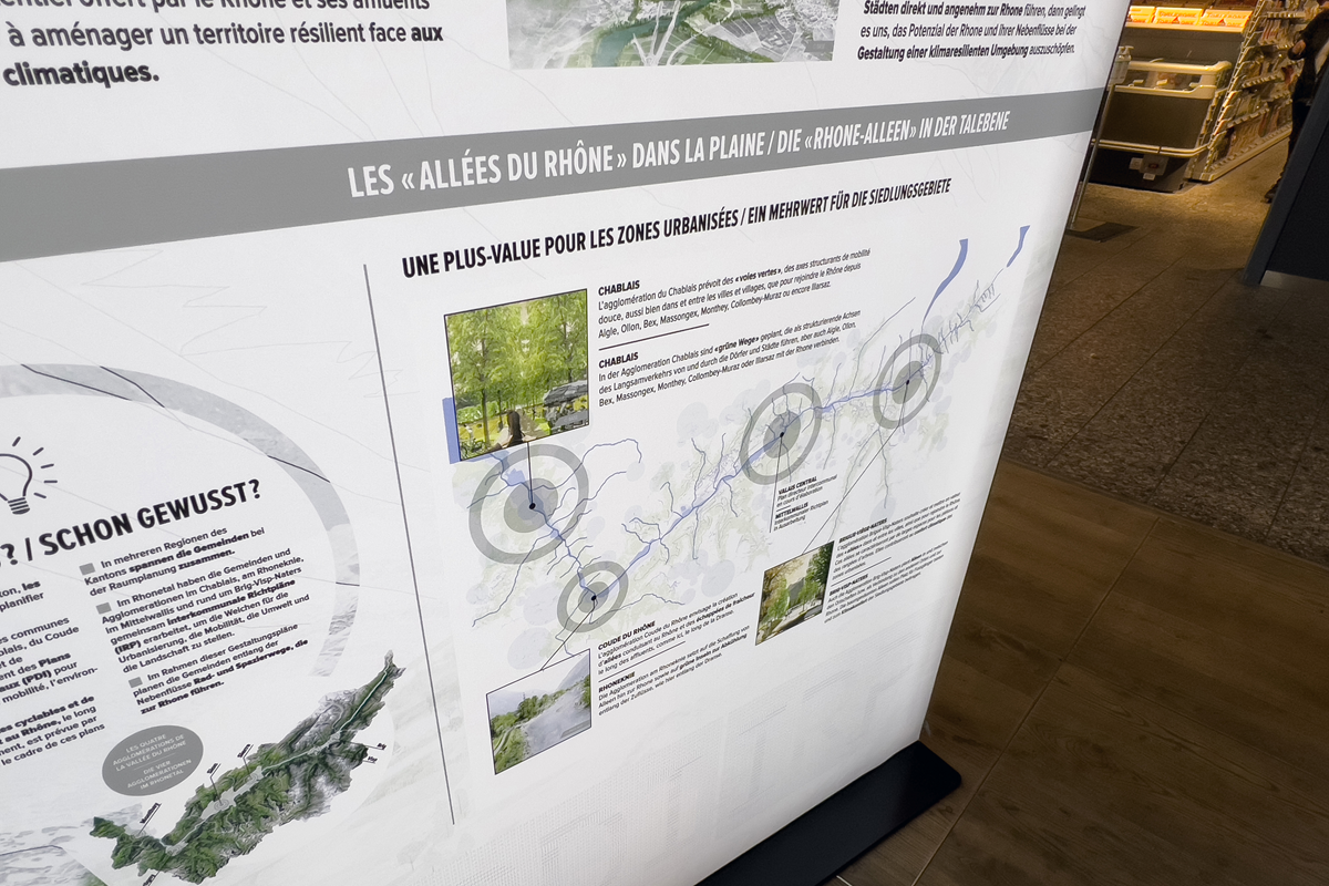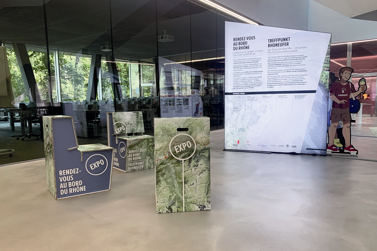 Conception et réalisation de l’exposition itinérante « Rendez-vous au bord du Rhône » en collaboration avec le Service des dangers naturels (SDANA). Elle met en lumière les rôles que peuvent jouer le fleuve et ses berges pour améliorer la capacité d’adaptation du territoire valaisan aux défis futurs, notamment le changement climatique.