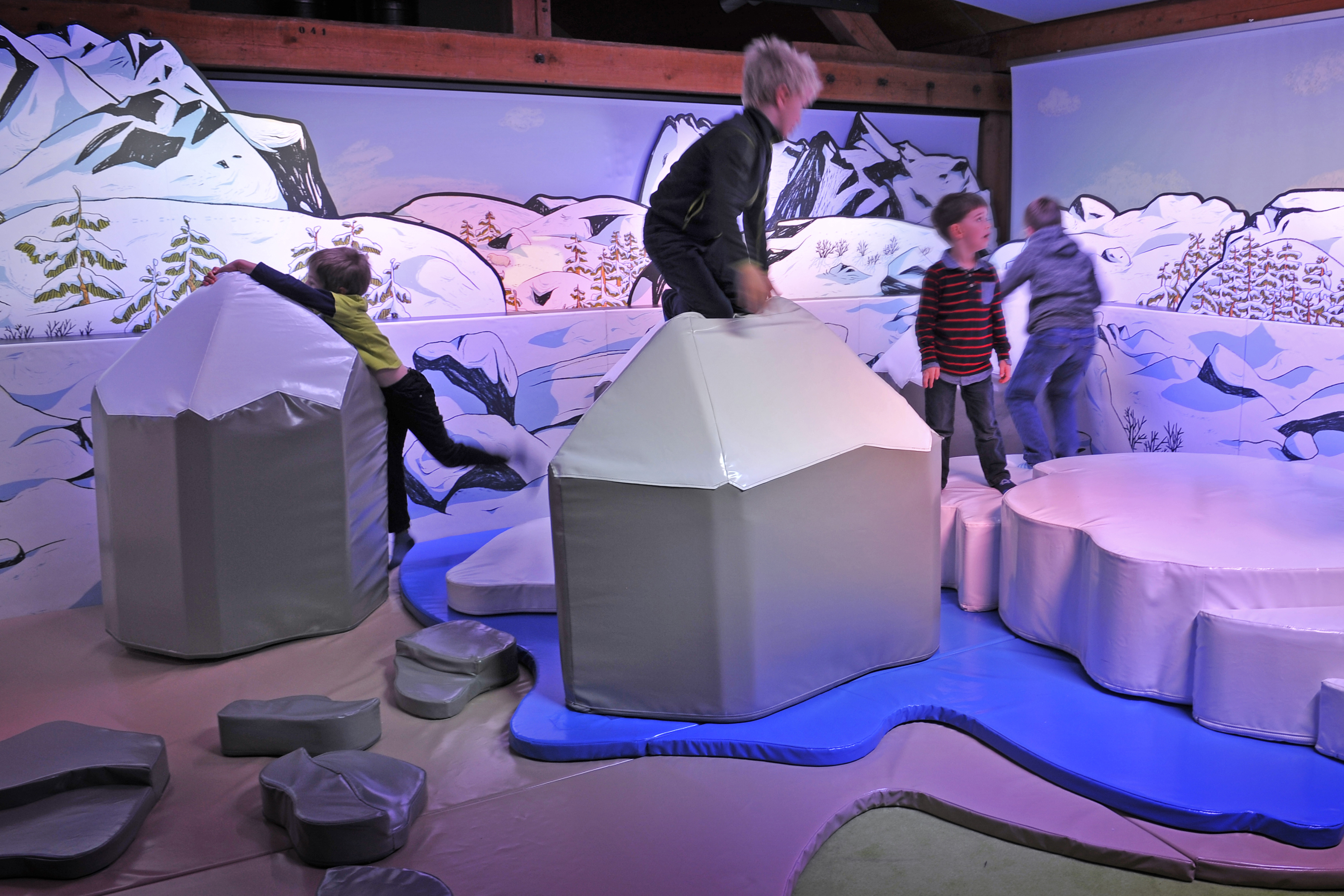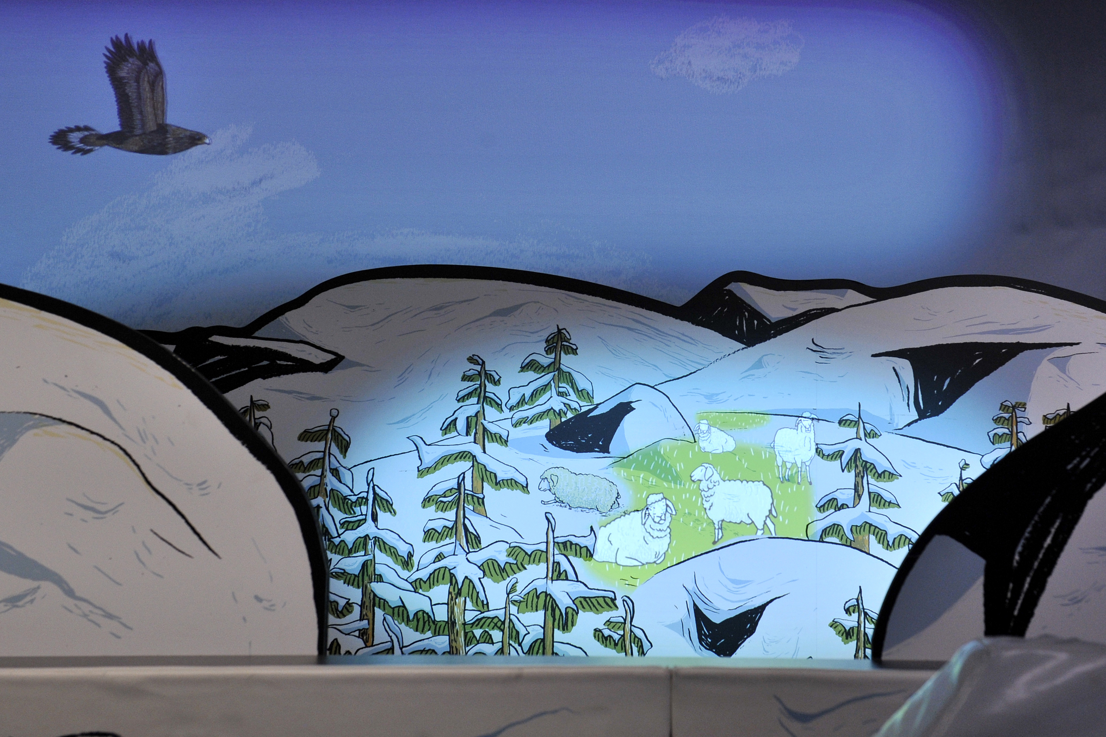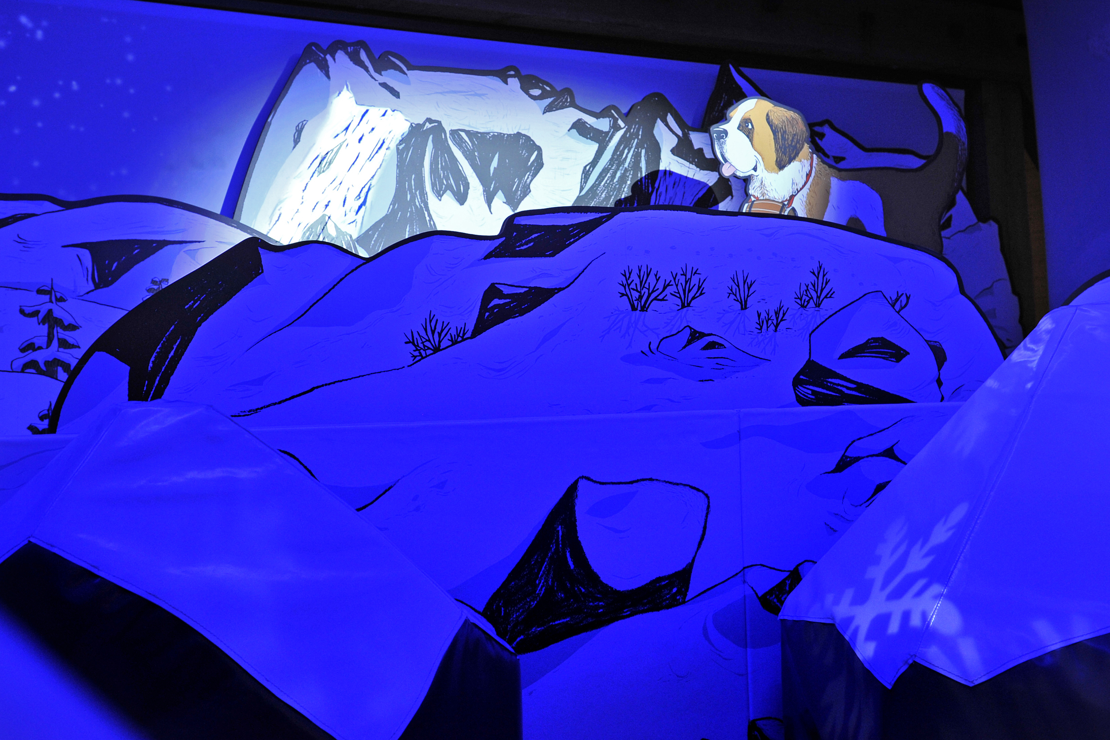 Dans un décor alpin, les enfants peuvent évoluer librement en découvrant l’histoire de l’hospice du Grand Saint-Bernard et ses célèbres chiens. Sculpture cinétique, show interactif, présentations de chiens vivants… L’espace se veut modulaire et flexible, pour une expérience toujours différente et ludique.