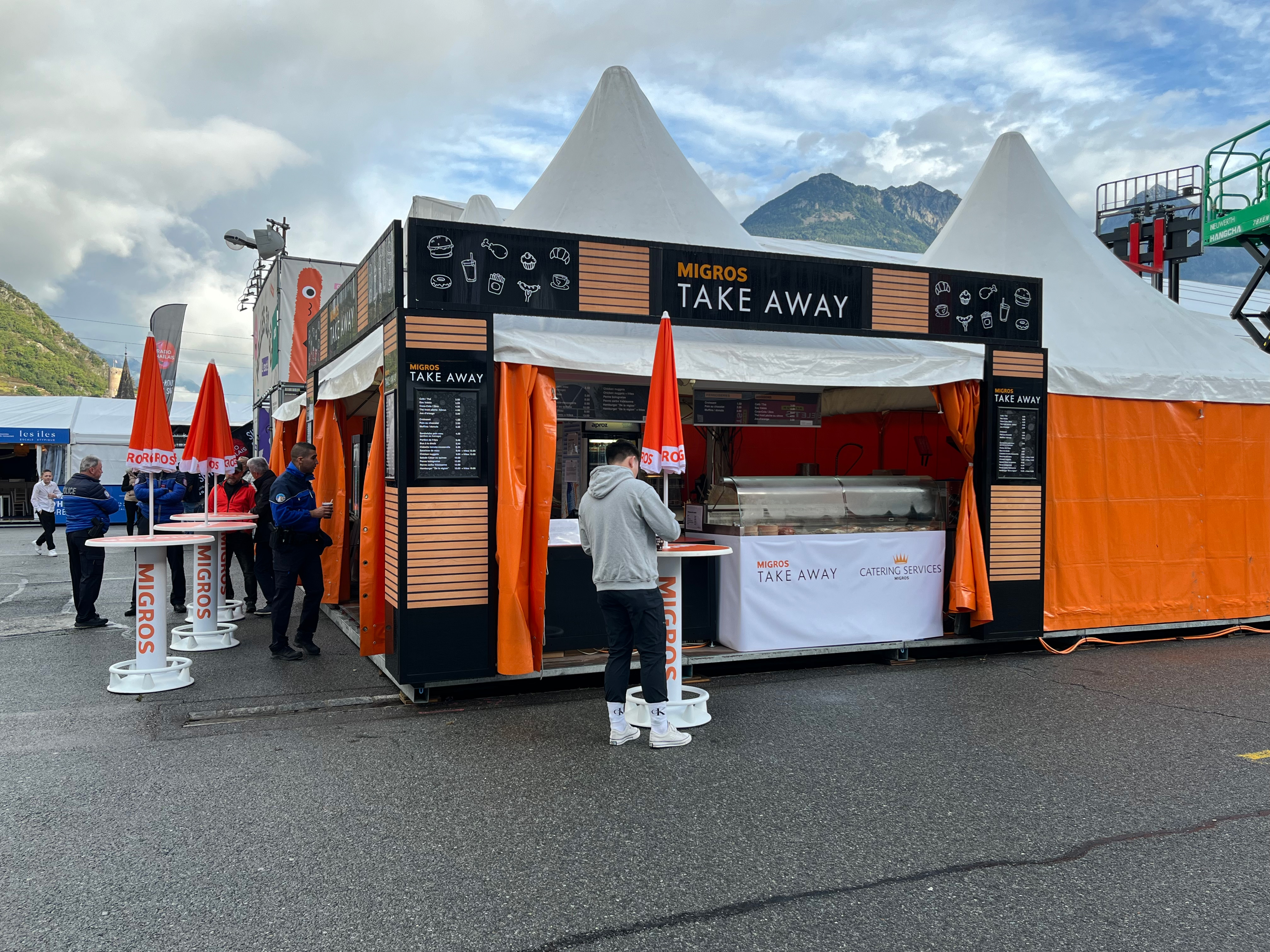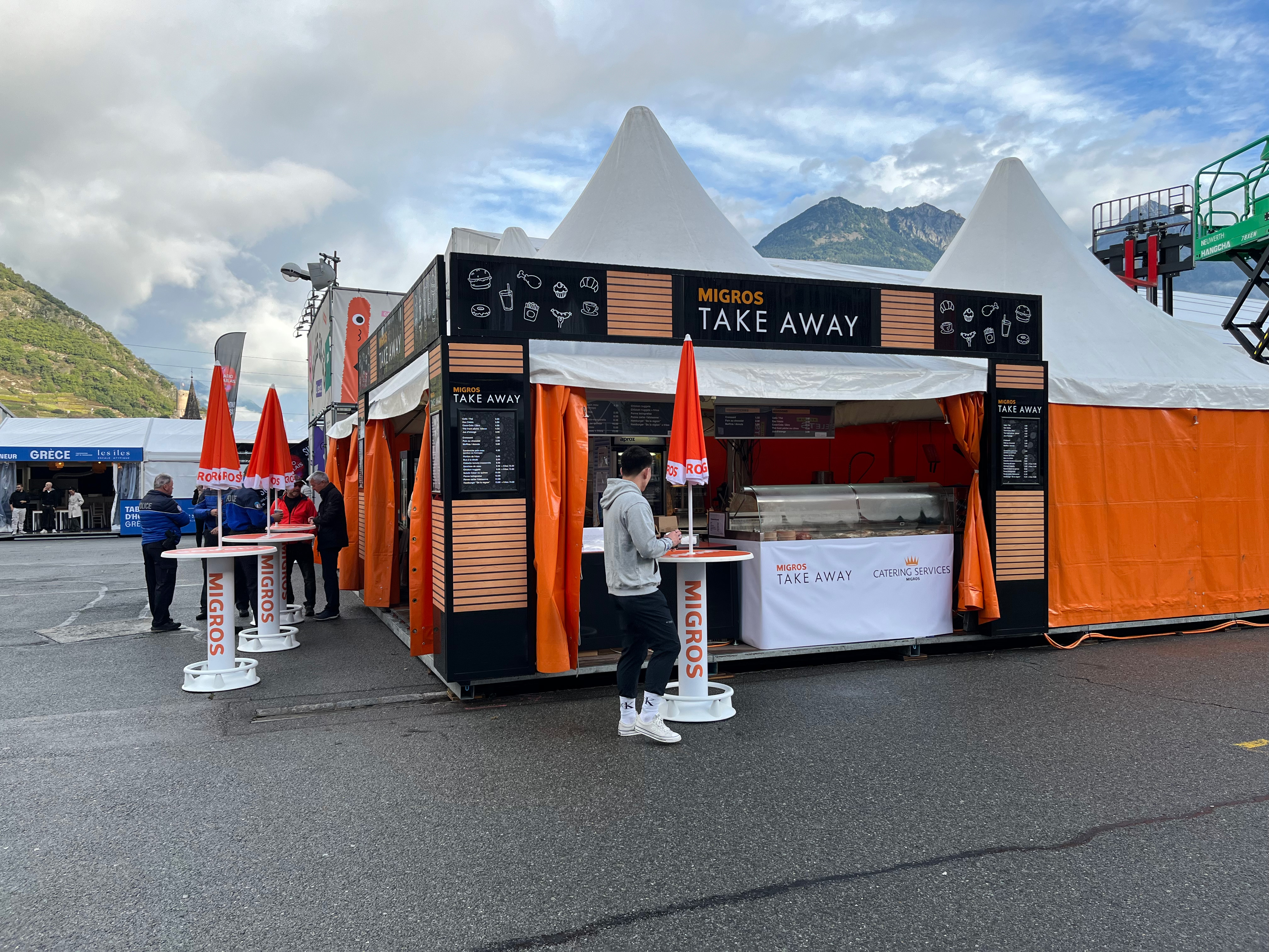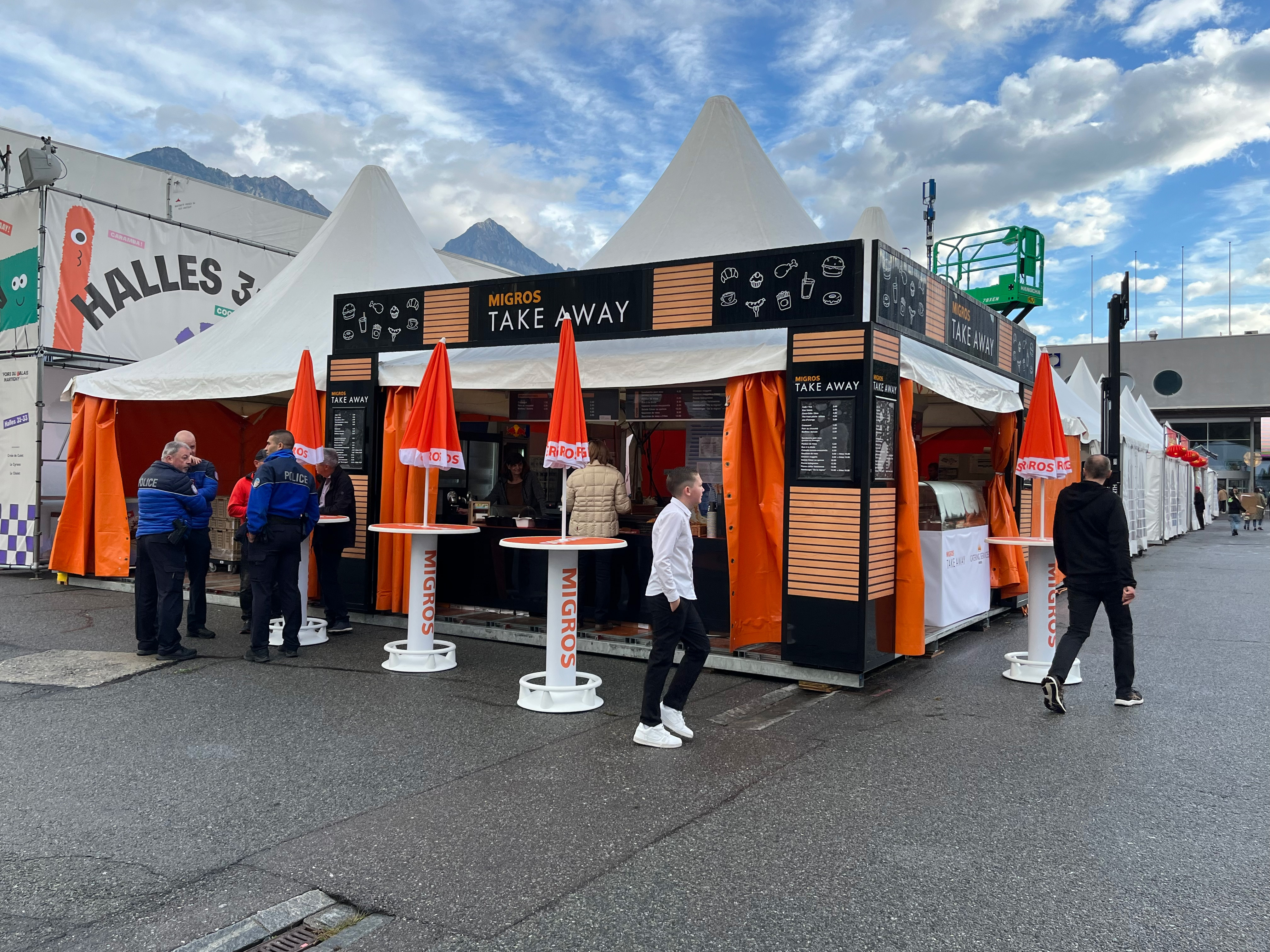 Conception et réalisation de la devanture du stand Migros Take-Away à la Foire du Valais, offrant une expérience culinaire conviviale et régionale.