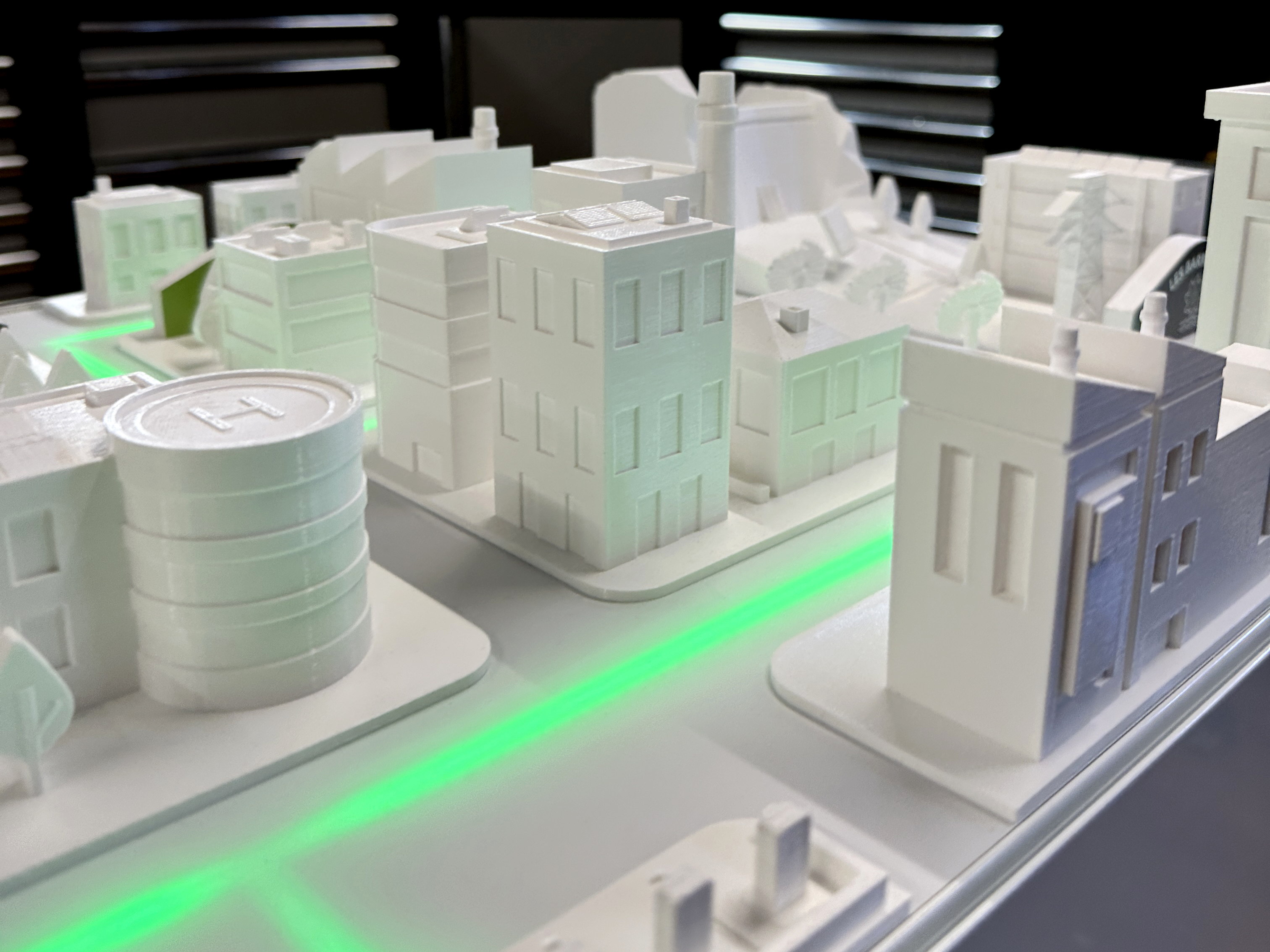 Composée de plusieurs secteurs, cette ville miniature illustre les différentes formes d’énergie gérées par OIKEN. Des tirettes offrent des informations complémentaires, tandis qu’un chemin lumineux LED guide le visiteur à travers les différentes énergies.