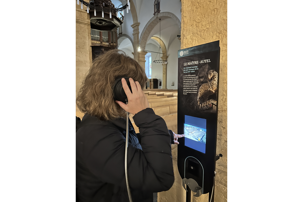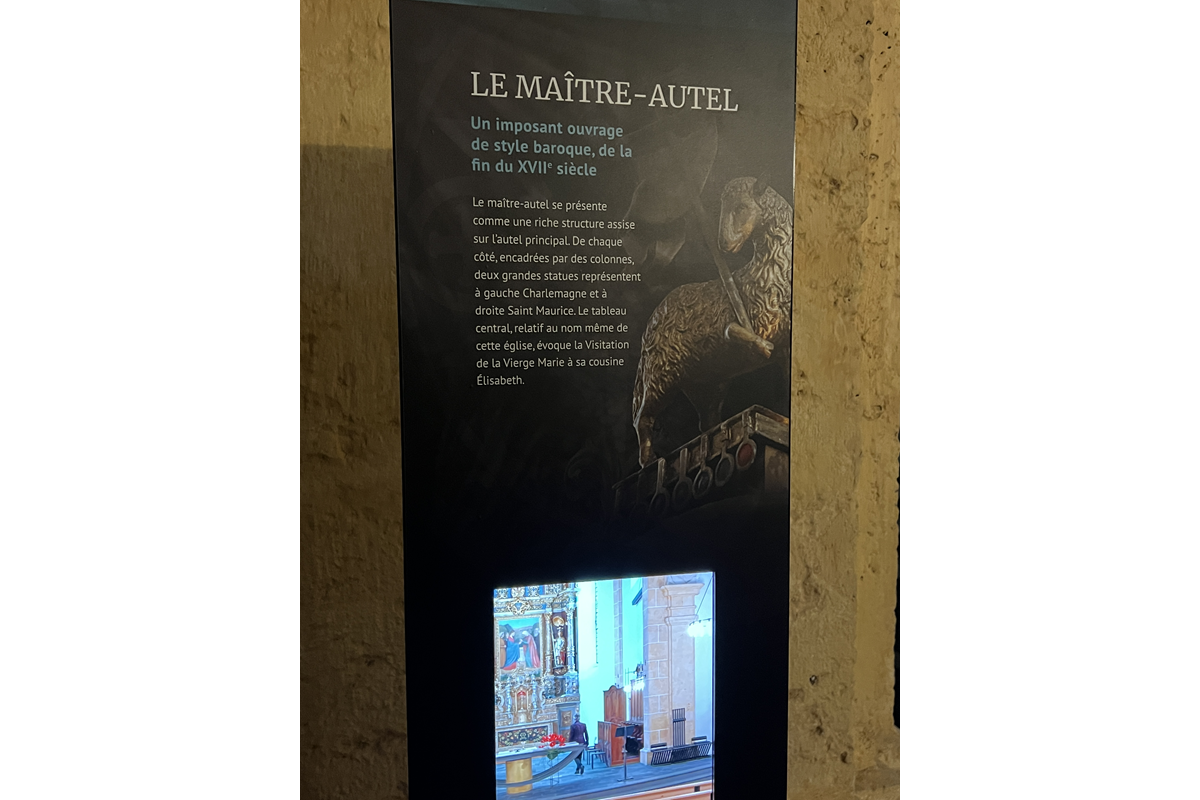 La visite permet d’en savoir sur les particularités de l’église. Grâce aux totems interactifs présents dans la nef, vous pourrez accéder à des vidéos et des informations concernant son histoire et ses trésors. Des boutons interactifs permettant d’éclairer les différentes thématiques sont également intégrés aux totems.