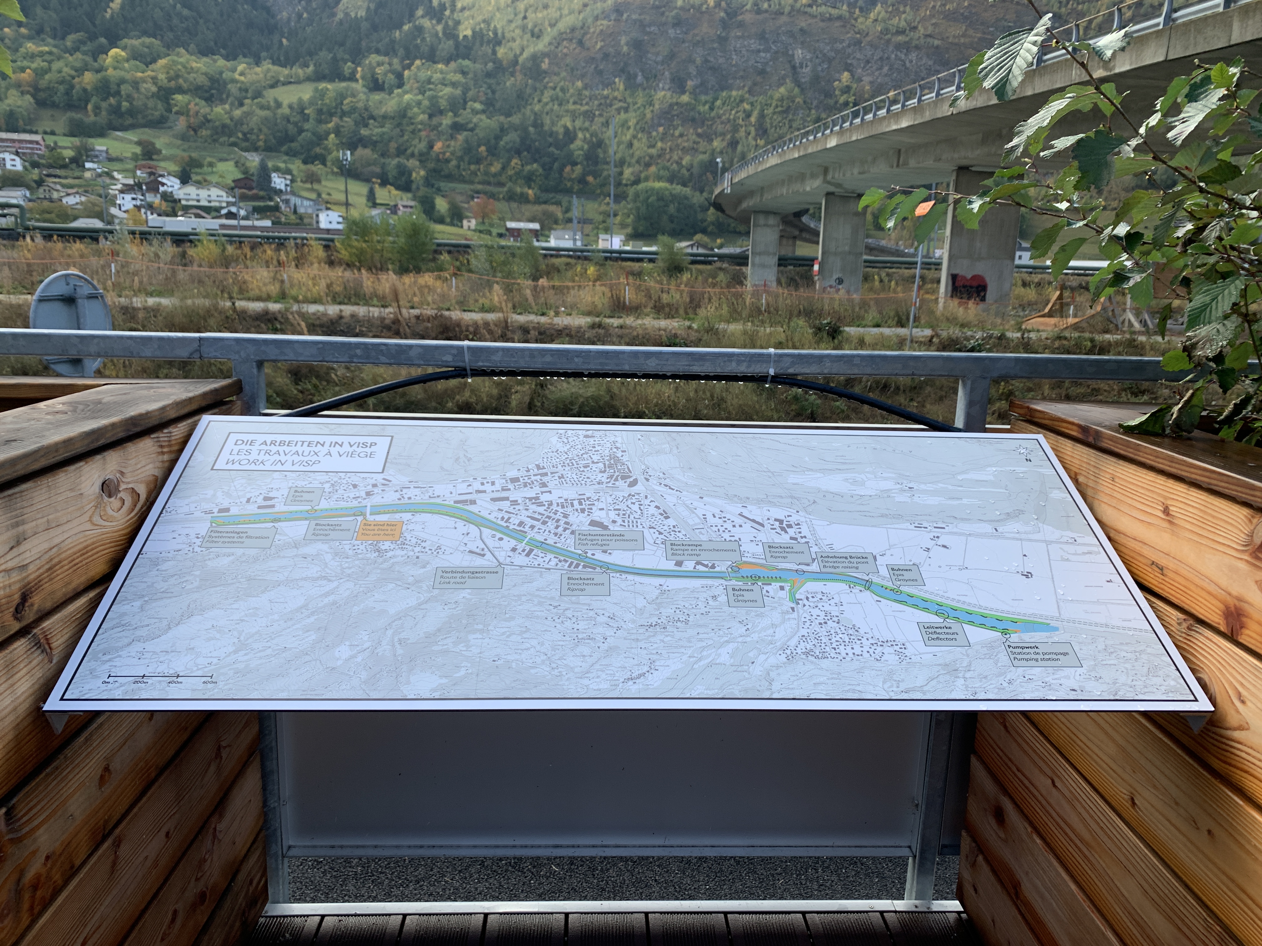 L’aménagement propose un coin de détente et de contemplation confortable et convivial. Les bancs contiennent des bacs intégrés dans lesquels sont présentés des plantes typiques que l’on peut rencontrer sur les berges du Rhône. En complément, une table didactique présente une rétrospective des travaux entrepris dans la région.