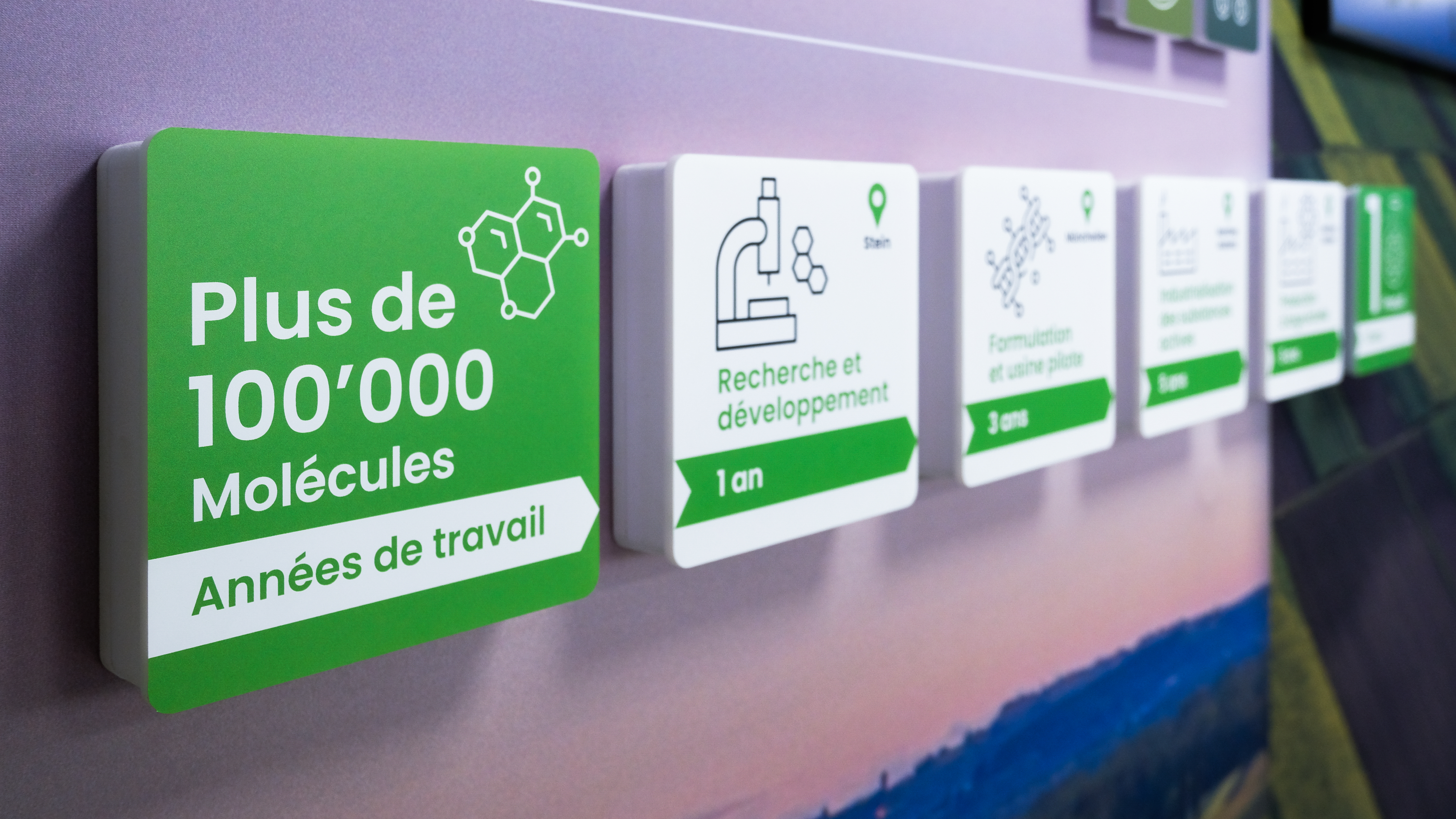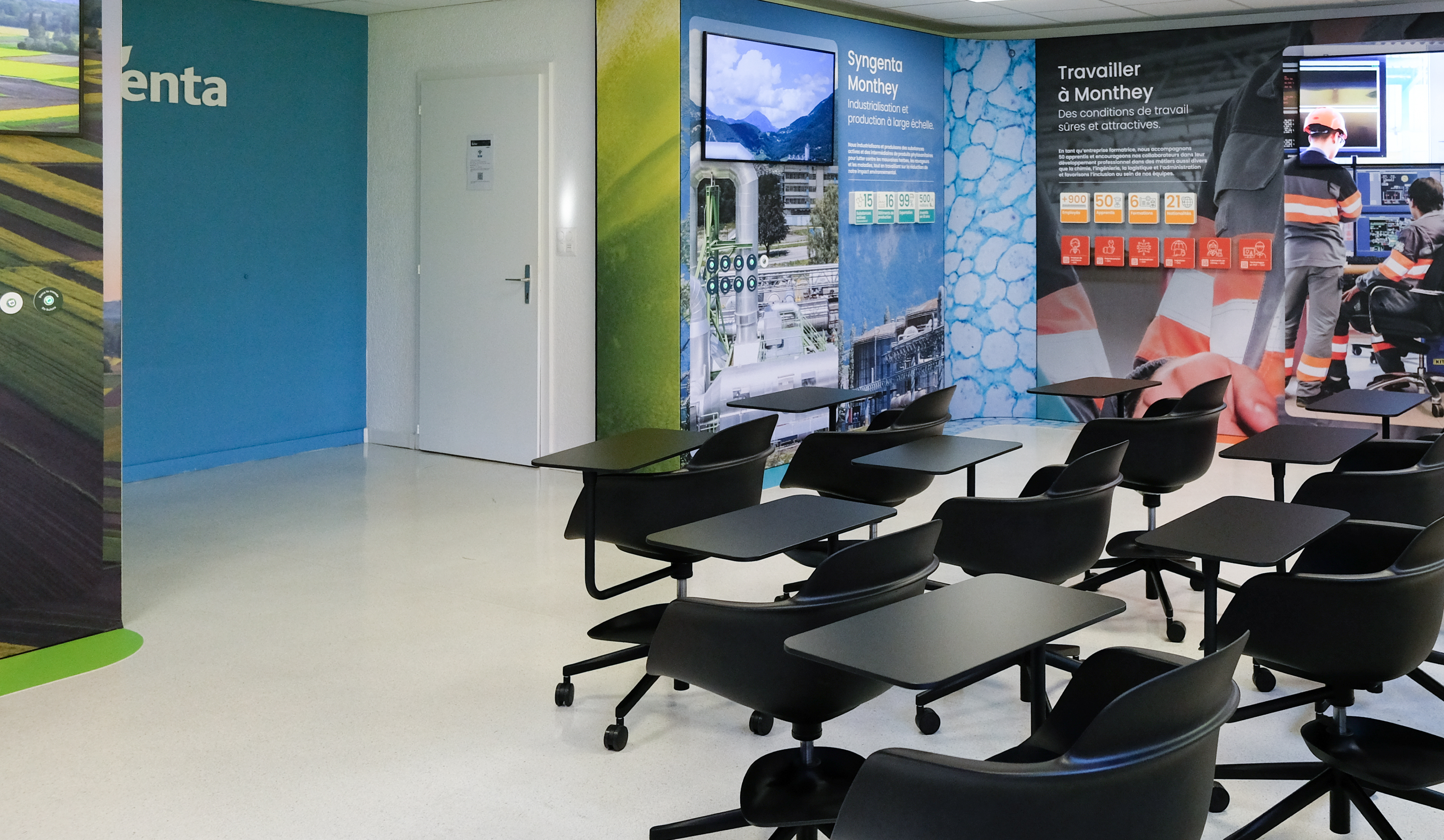 Conception et réalisation de mobilier informatif pour le site chimique de Syngenta, destiné à valoriser l'entreprise et à transmettre les informations clés aux visiteurs.