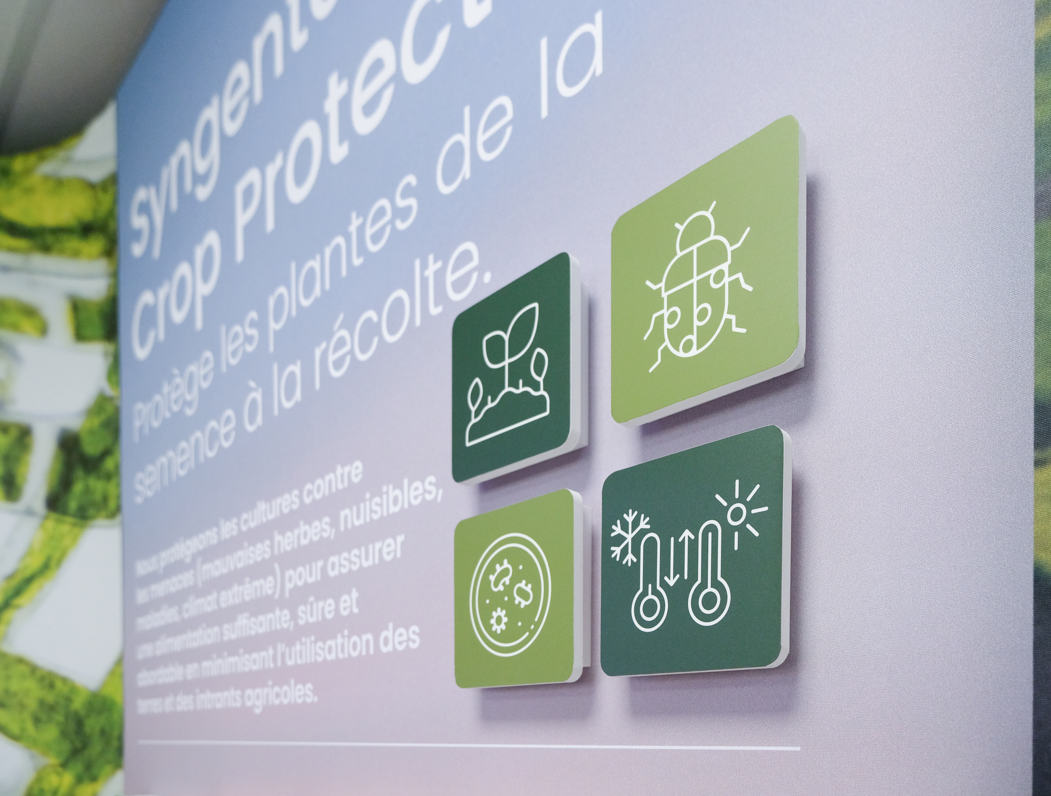 Des écrans intégrés dans les visuels aux pictogrammes lumineux, le Visitor Center a été pensé pour plonger le visiteur au cœur de Syngenta. Ce dernier est guidé par un ou une présentatrice qui utilise les boutons intégrés dans les parois pour activer les différentes animations. Chaque élément a été pensé pour être ergonomique, interactif et clair, offrant une expérience à la fois pédagogique et engageante.